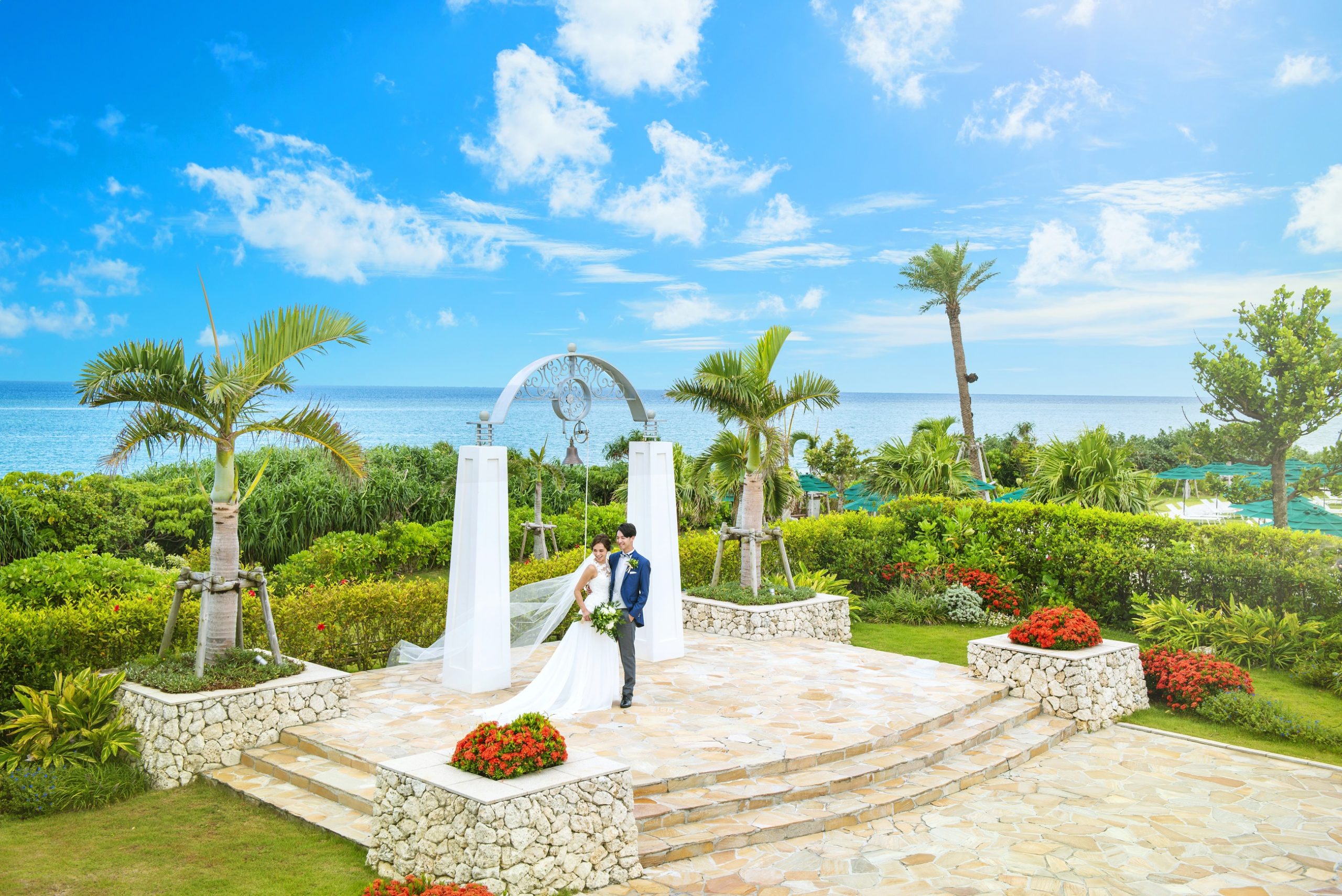 昼間は輝く水平線、夕方にはため息がもれるような夕景を楽しめるガーデンで記念撮影や演出を自由に楽しんで