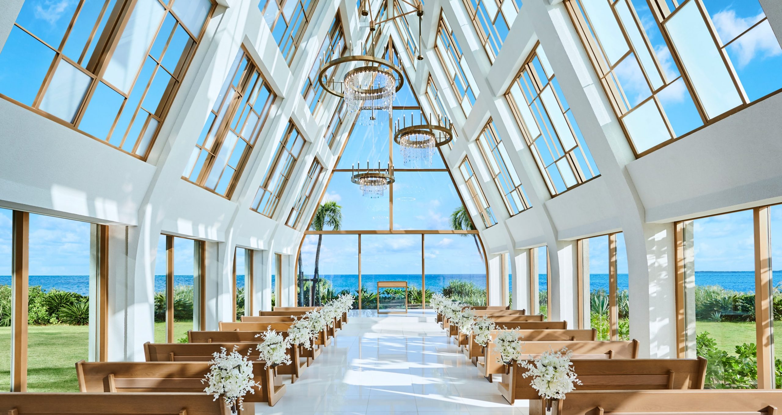 琉球ガラスが輝くシャンデリアに光を注ぐのは、それぞれ異なる形をしたガラスの天窓。開放感が心地良い三角屋根のチャペルで、一生に一度の誓いを。