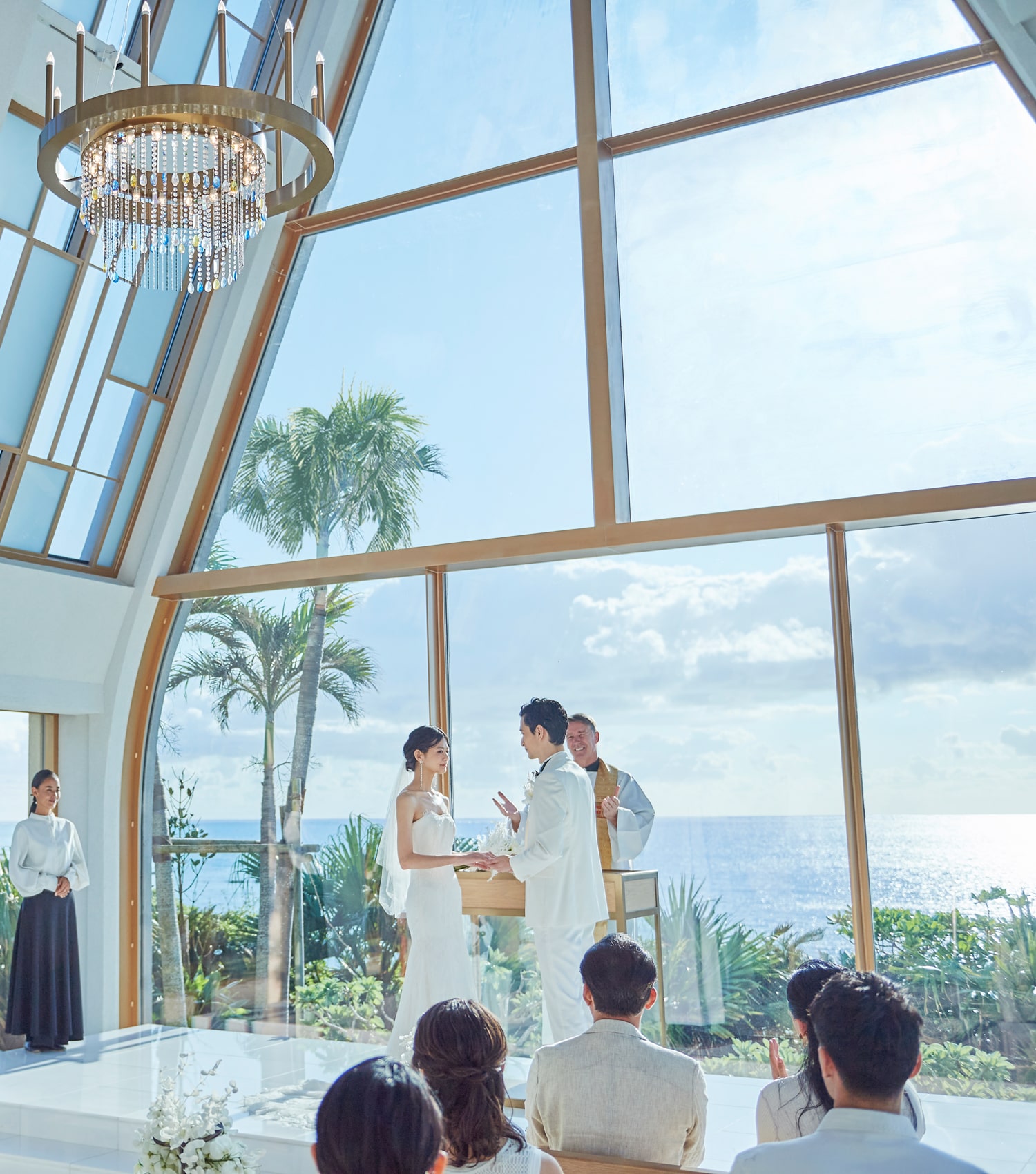 삼각 지붕 아래로 부드럽게 퍼지는 개방감 넘치는 채플.