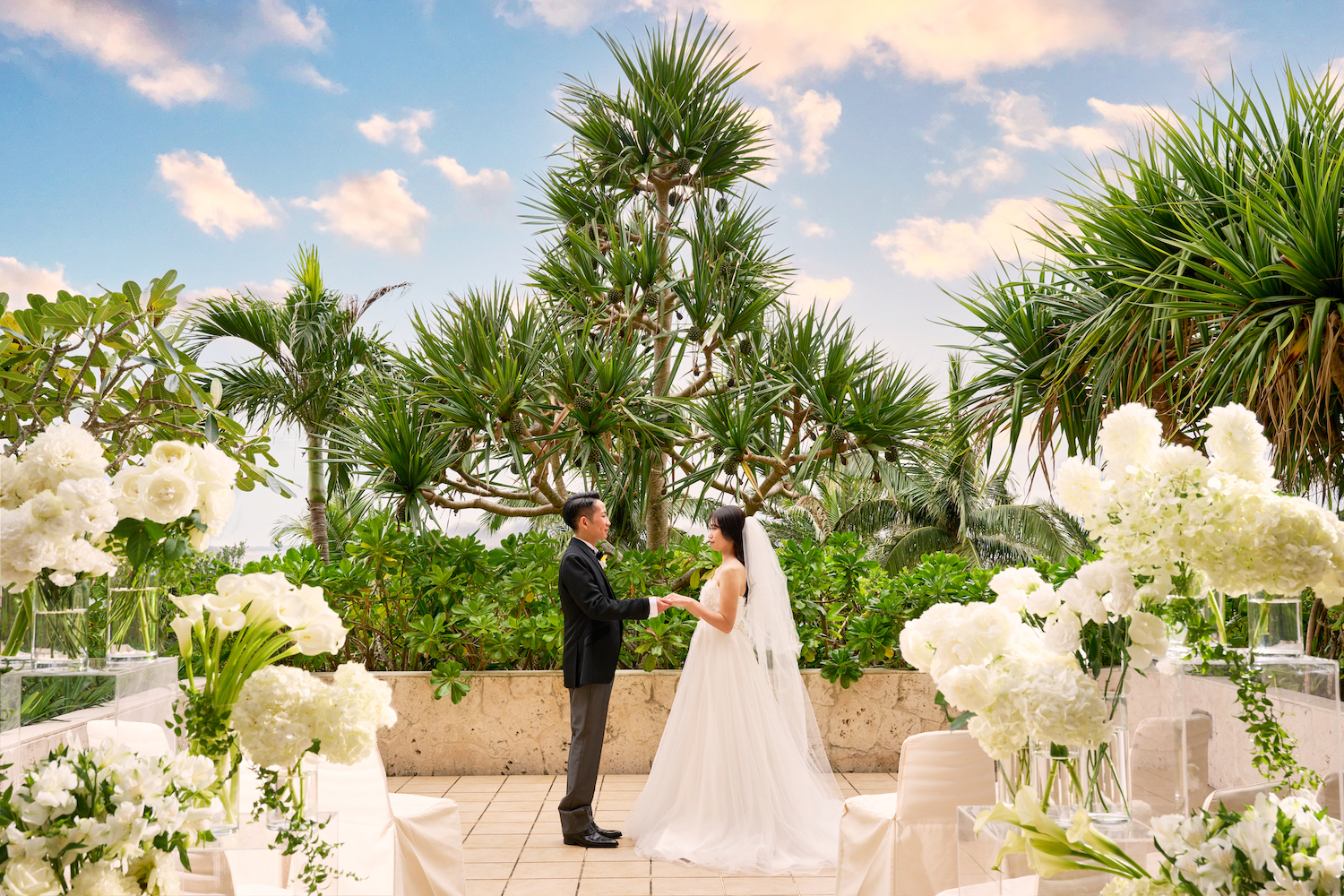 陽光が降り注ぐテラスで永遠の愛を誓い、シェフのパフォーマンスを楽しむ特別なディナー。