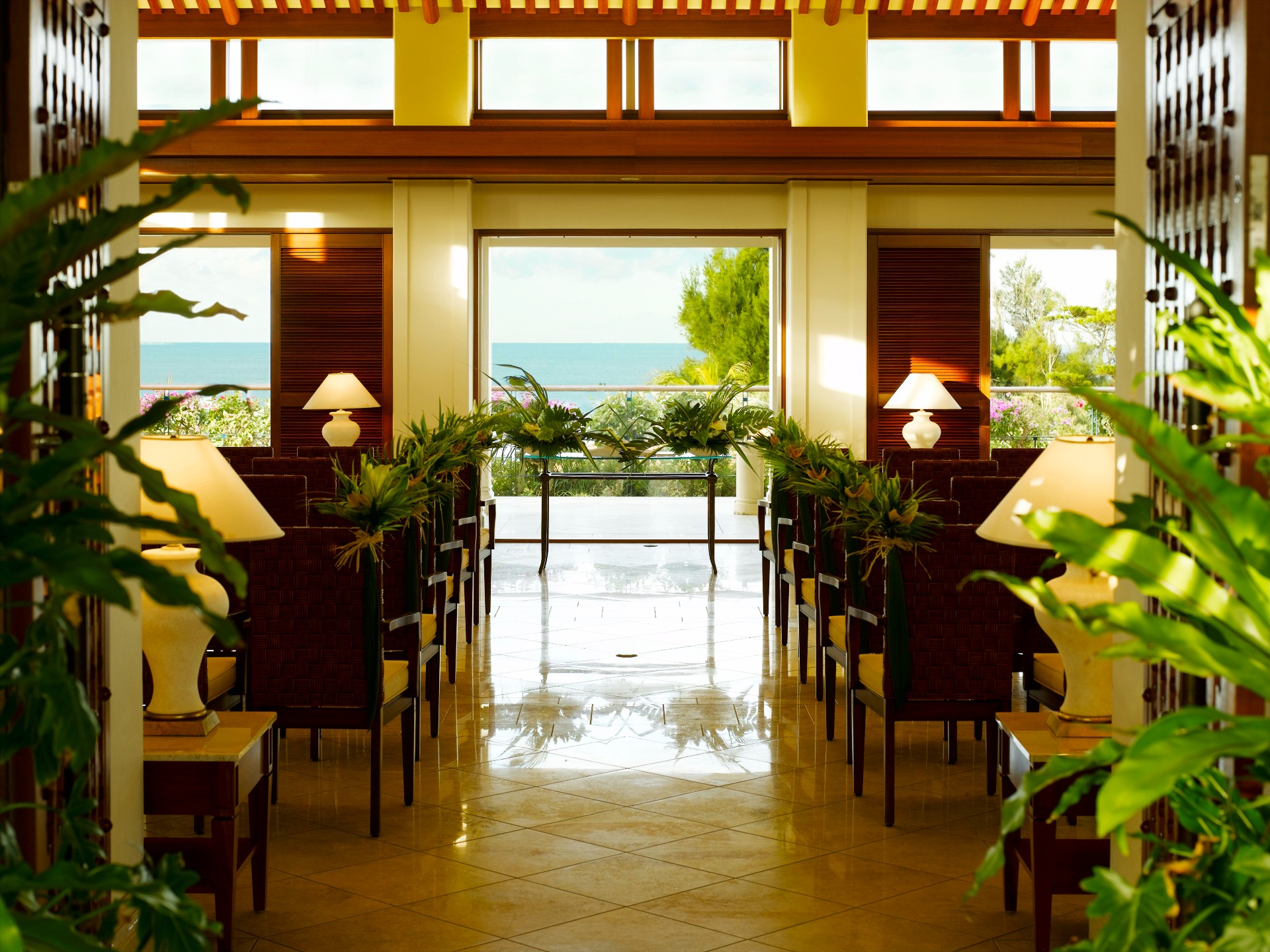 おふたりの大切な方を高いクオリティーでもてなしたいという想いから万国津梁館の結婚式は一日一組限定です。挙式時間を自由に設定することが出来ます。東に名護湾、西に東シナ海の水平線を臨むガーデンが広がり、写真撮影も可能です。