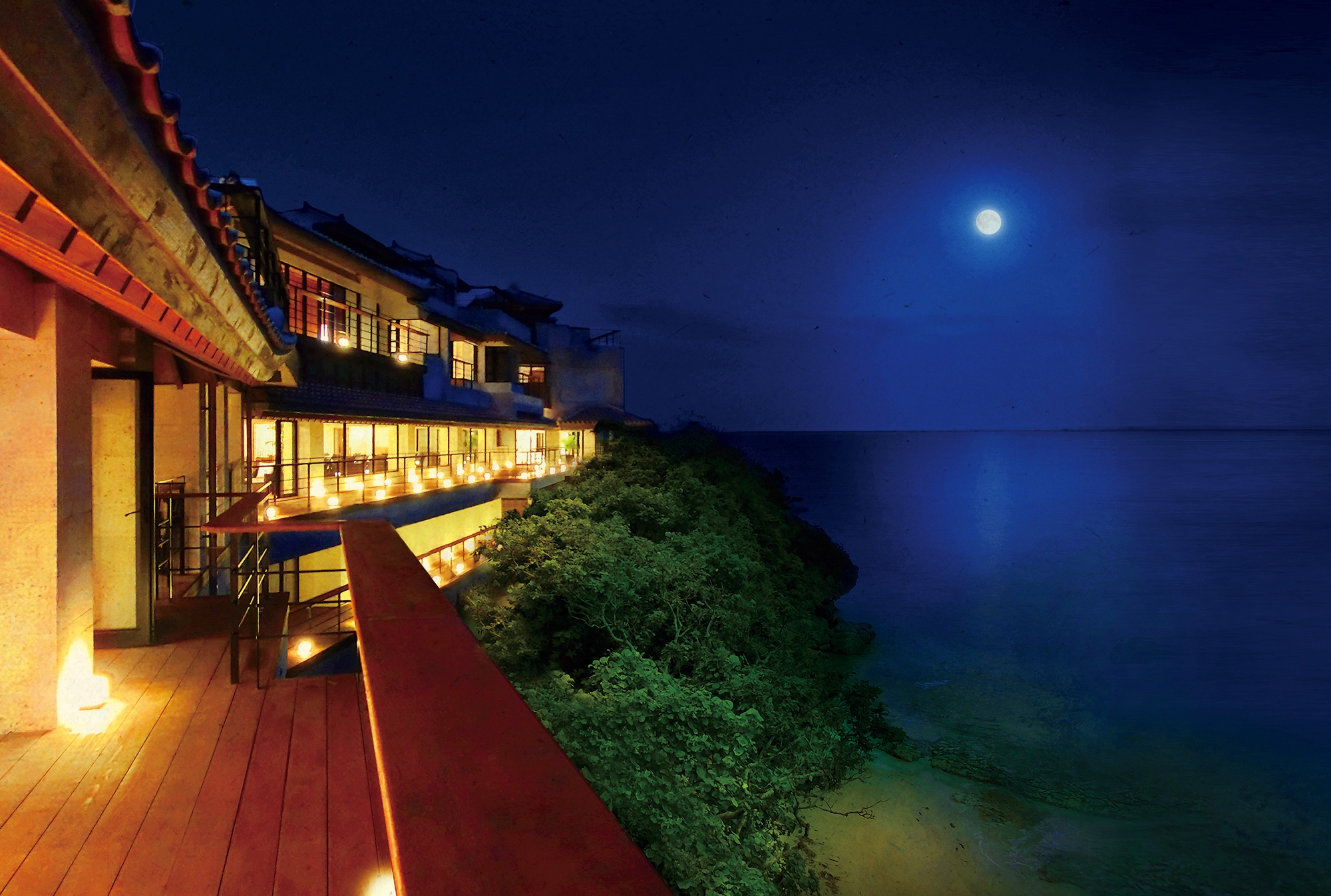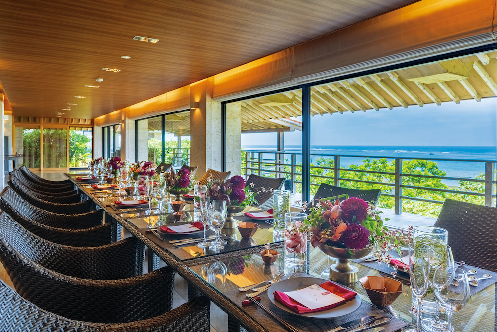 海に沿って水平にのびる「ダイニング甘露」は、紺碧の海が包み込む幻想的な空間。お料理は、新鮮な地の食材と旬の恵みを活かし、琉球と和を取り入れた趣深い和琉会席。さらに、祝宴スタイルに合わせ様々なお料理を心を込めてお贈りします。