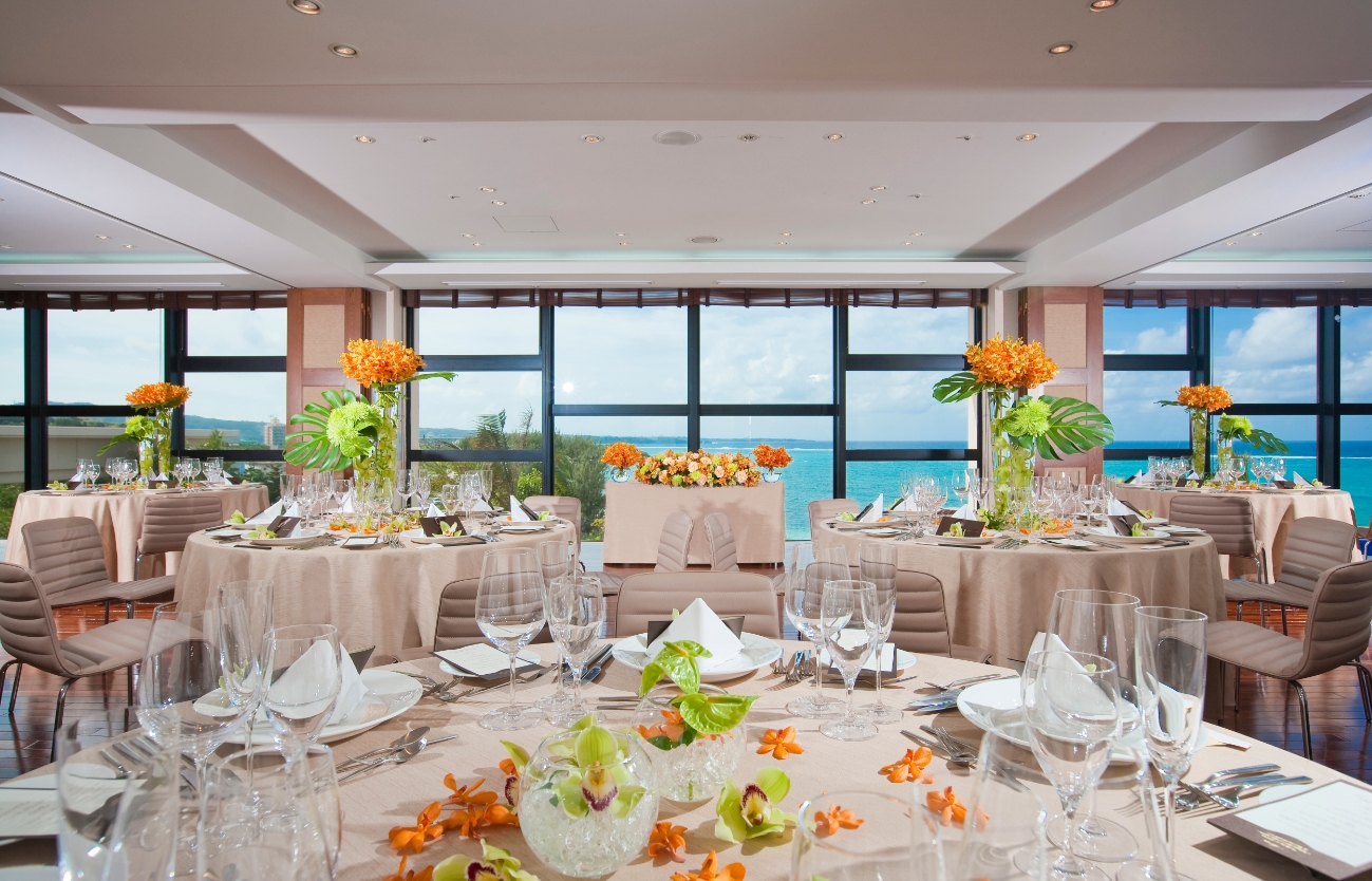 - 会場の扉を開くと目の前一面に広がる恩納村の海と空