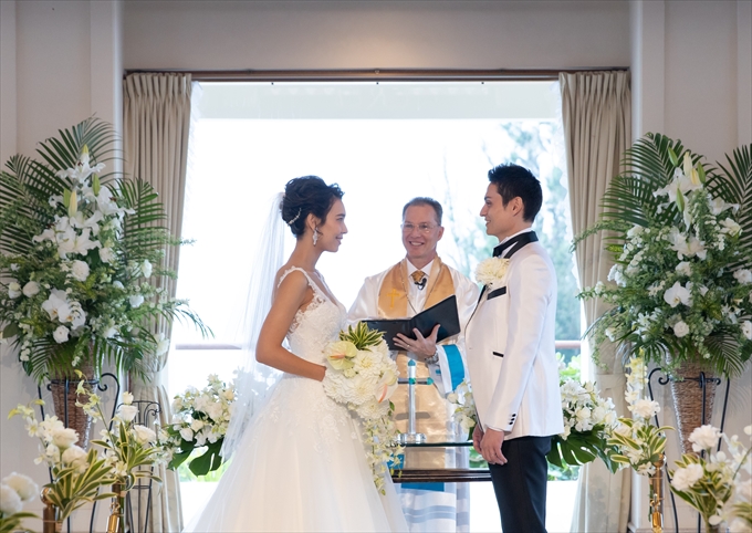おふたりの大切な方を高いクオリティーでもてなしたいという想いから万国津梁館の結婚式は一日一組限定です。挙式時間を自由に設定することが出来ます。東に名護湾、西に東シナ海の水平線を臨むガーデンが広がり、写真撮影も可能です。