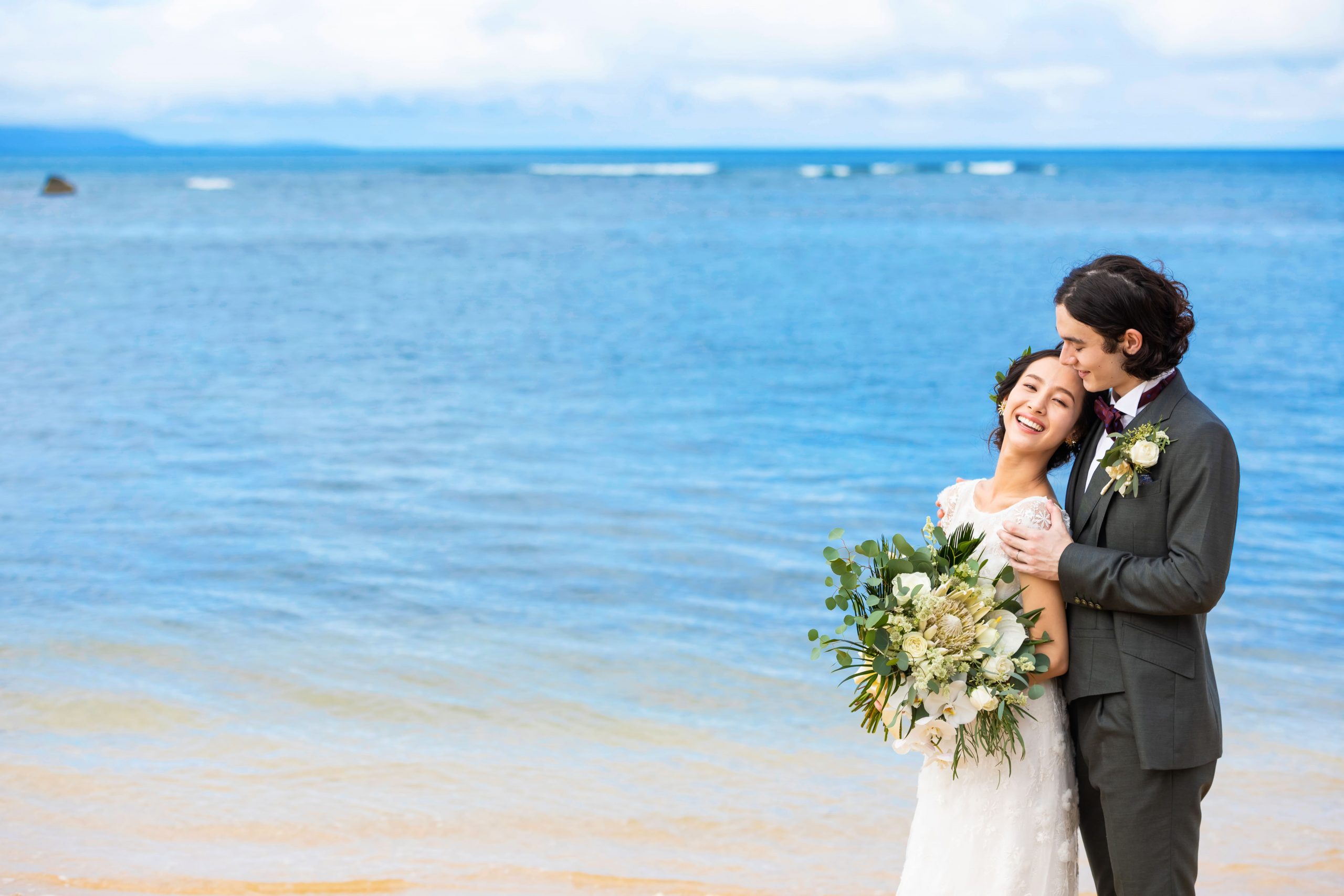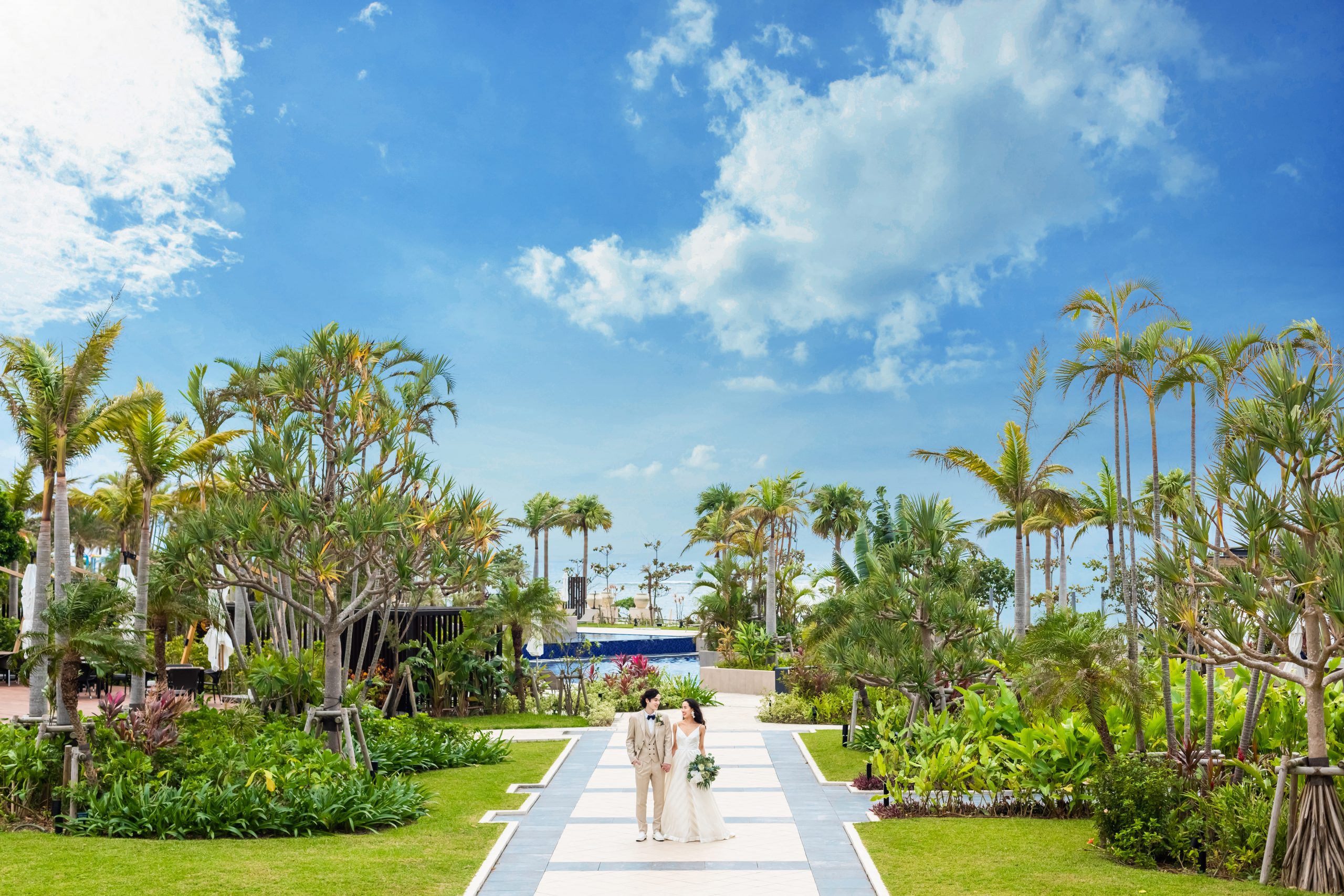 挙式後には、ホテルに隣接している天然ビーチと真っ青な空に映えるグリーンを背景に、フォトジェニックなロケーション撮影をお楽しみください。