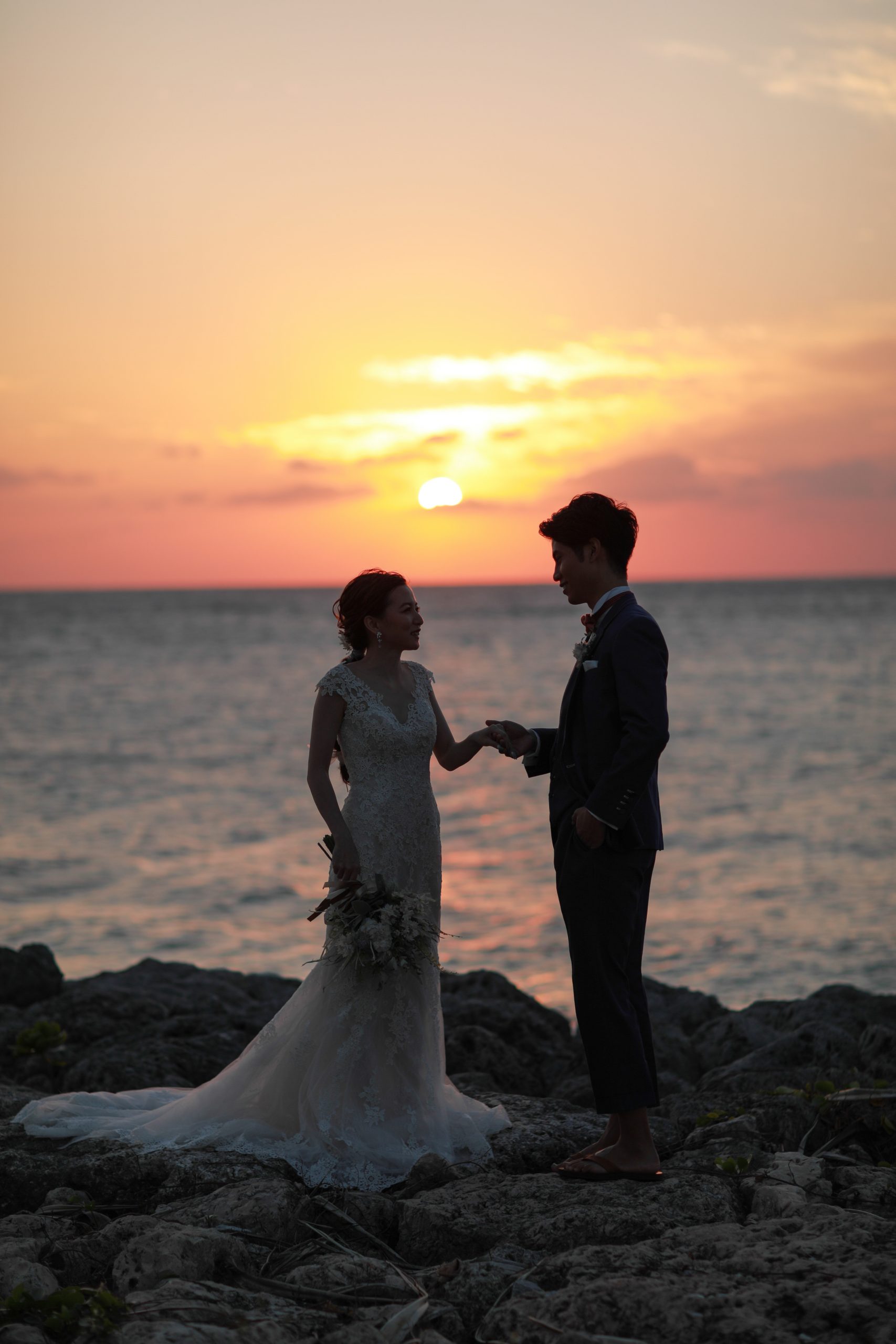 • サンセットでのビーチウエディングも人気。「かりゆしビーチ」で沖縄の風を感じながら幻想的な挙式ができます
